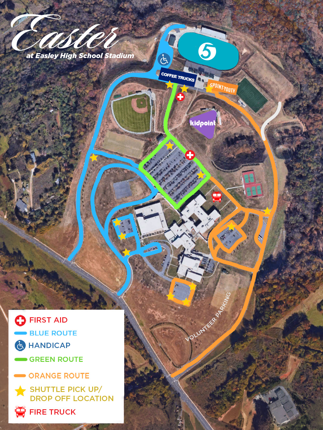 Ask any volunteer team member. They can help with parking direction, entrances, seating, and activities locations.